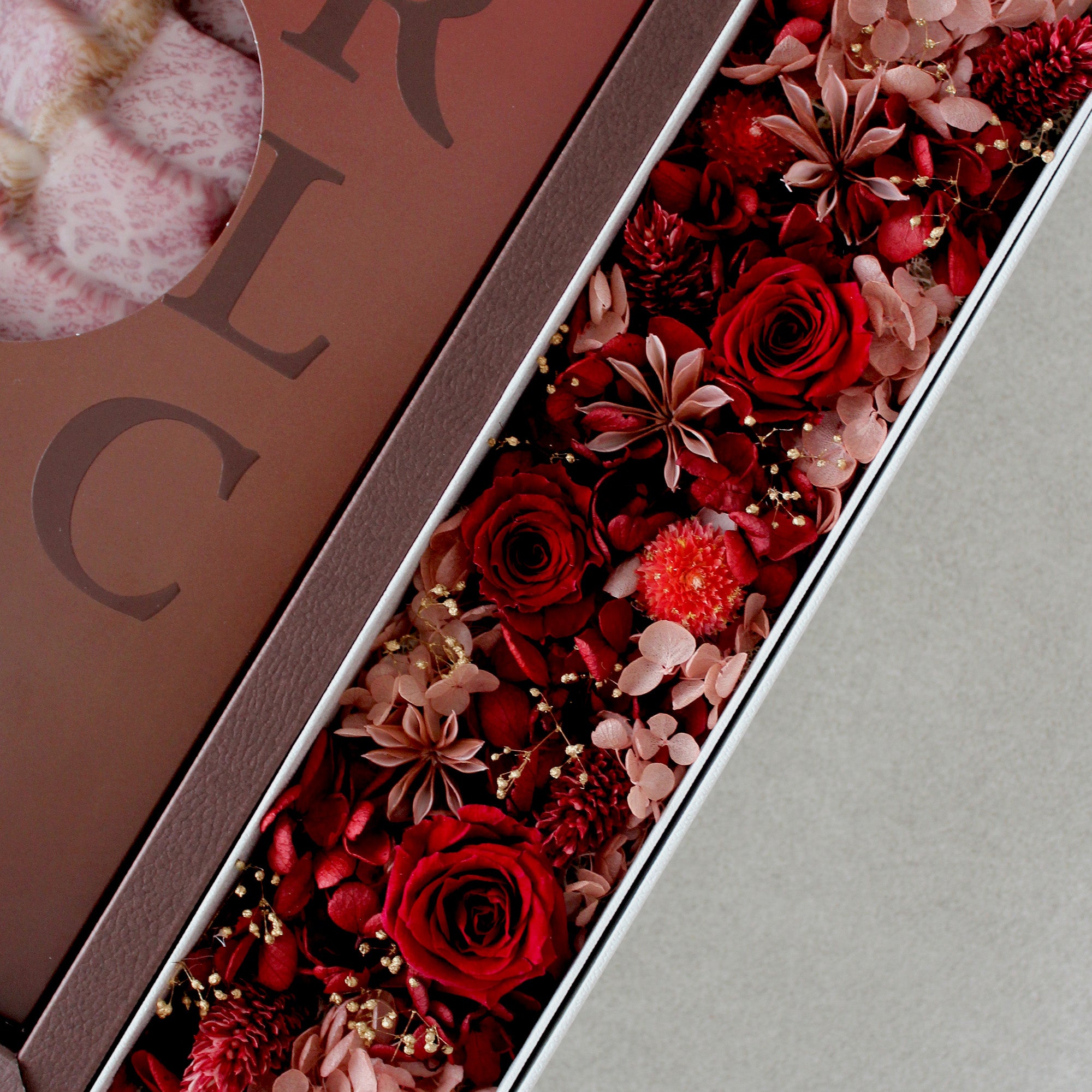 贅沢に敷き詰めたフラワーボックス。深紅のバラやニュアンスピンクの花々を中心に、ギフトにふさわしい上質な色彩でまとめました。